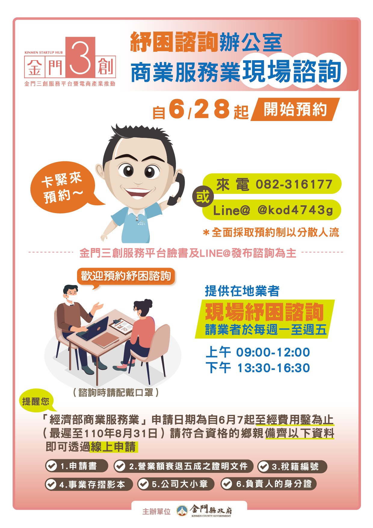 鑑於中央流行疫情指揮中心公告三級警戒延至七月十二日,以及考量經濟部商業服務業紓困補助採全面線上申請,地區傳統及年長業者不諳電腦操作,金門三創服務平台將視疫情狀況並配合防疫措施,規劃六月三十日起開放現場諮詢,有需求的民眾可在六月二十八日起進行預約。(工商發展科)