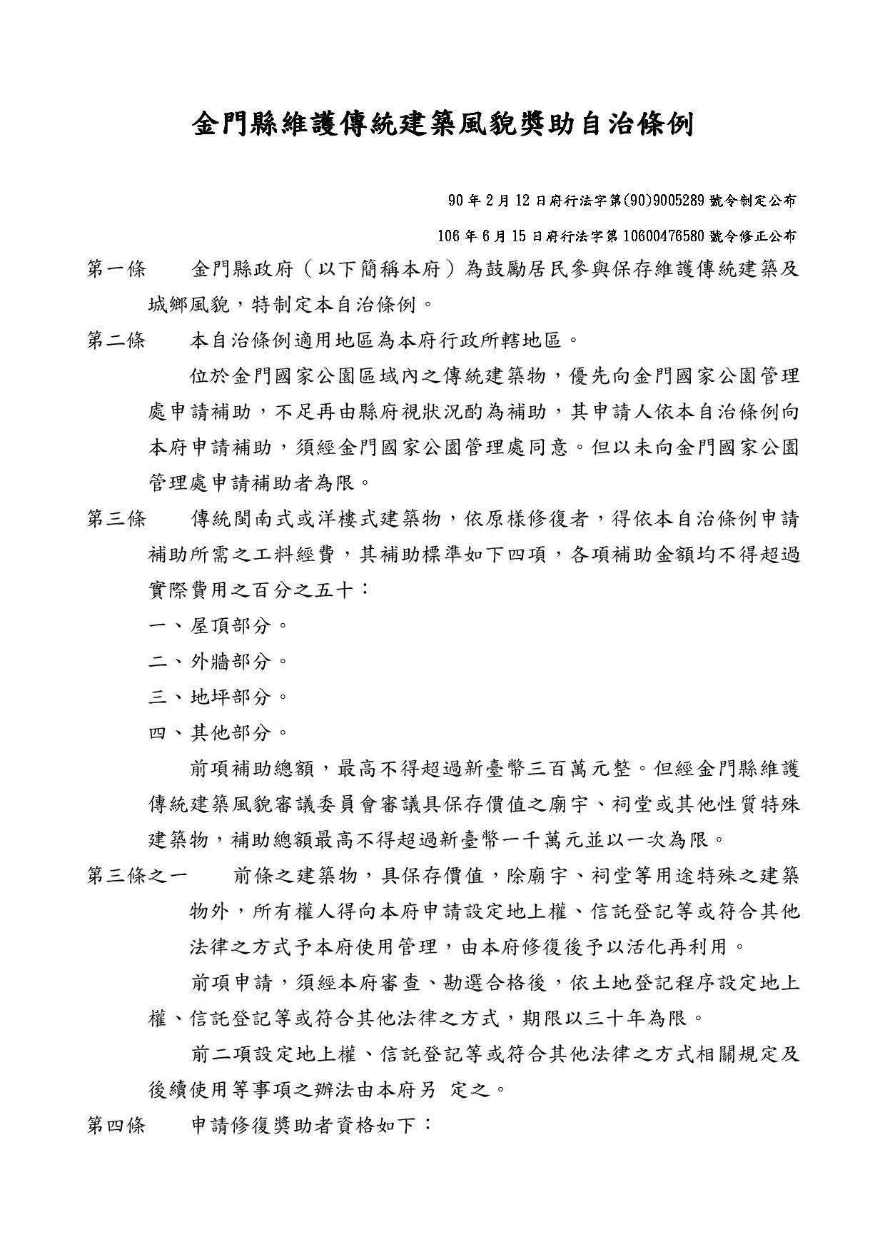 二、法令依據:金門縣維護傳統建築風貌自治條例、金門縣維護傳統建築風貌建築審議原則、金門縣維護傳統建築風貌建築物修繕獎助金額核算基準表、金門縣政府對民間團體及個人補(捐)助經費作業要點。